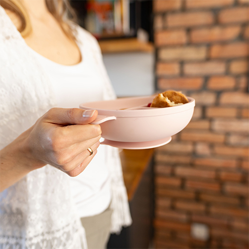 Силната вакуумска основа ја држи чинијата цврсто на место, а заоблената форма овозможува полесно собирање на храната. Трите прегради овозможуваат одделно сервирање на различни намирници, со што детето може да го открива секој вкус посебно.